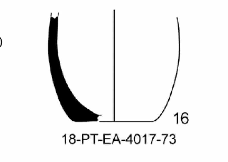 Mitad inferior de una pequeña olpe de cerámica griega de occidente de pasta clara. Localizada en los niveles de la fase 1A de la fachada marítima de la Neápolis, sector Moll Grec.