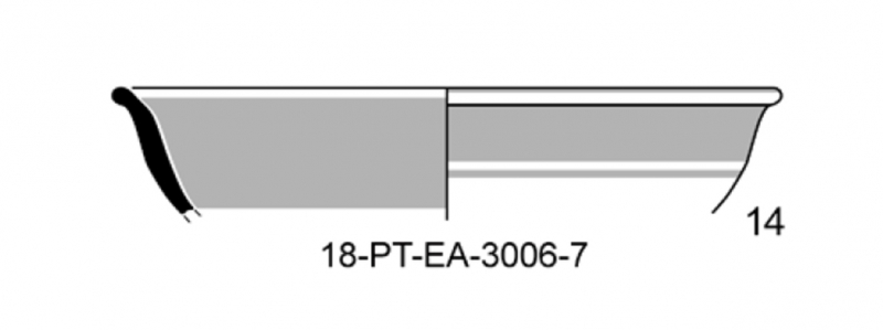 Copa de cerámica griega de occidente de pasta clara con forma inspirada en la tradición jonia, tipo Bats 423 (PY 1993), en este caso de perfil contínuo y curvilíneo. Hallada en los niveles de la fase 1B del sector del Moll Grec de la fachada marítima de la Neápolis.
