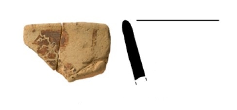 Vaso abierto con decoración figurada, de producción incierta, aunque bien podría ser de origen massaliota. Hallado en los niveles de la fase 2A de la fachada marítima (sector playa del Moll Grec) de la Neápolis de Empúries.