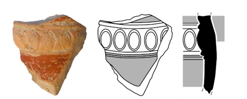 Posible soporte, con decoración pintada y en relieve formando una moldura con decoración de ovas. Hallado en los niveles de la fase 2B del sector N-22 del barrio portuario de la Neápolis de Empúries.