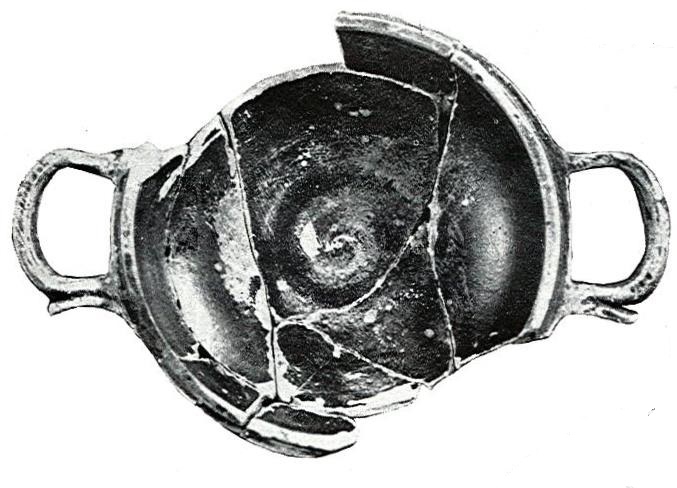 No es segura su procedencia de una necrópolis. La pieza presenta un pequeño reborde para la inserción de una tapadera. Reconstruido y restaurado.