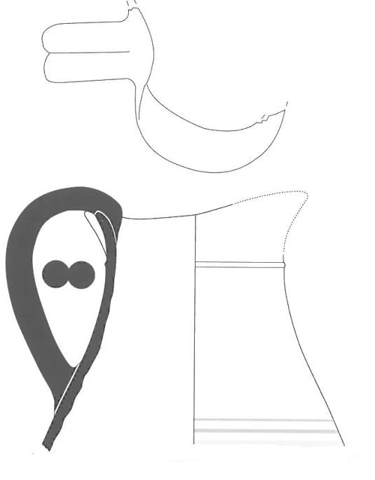 Tiene una asa bífida y la boca formada por unos amplios lóbulos, que recuerdan las jarras mas antiguas de la cerámica gris de Marsella (Arcelin-Pradelle 1984, 60), según AQUILUÉ et alii 2000. Pintura muy perdida de color negro-marrón.